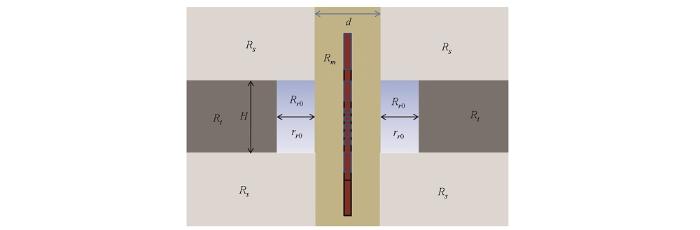 目前,针对阵列侧向测井的正演响应及环境因素校正研究已有了一定进展。仵杰等[11]对阵列侧向测井在二维地层模型下的响应进行了研究;邓少贵等[12]对斜井中的阵列侧向测井响应进行了正演模拟研究;刘振华等[13]研究了阵列侧向测井的径向侵入特性、井眼效应和层厚影响;潘克家等[14]研究了包含井眼、侵入带、围岩和目的层的轴对称地层模型中的阵列侧向测井正演响应;邓少贵等[15]研究了煤层气储层中的阵列侧向测井响应,总结了响应规律;范宜仁等[16]基于有限元方法,研究了阵列侧向测井在简化的二维非均匀介质模型下的正演响应;祝鹏等[17]研究了大斜度井及水平井中的阵列侧向测井正演响应。调研可知,目前关于阵列侧向测井的正演响应研究较多,但未有文献提出明确的环境因素校正方法[18]。EALT为2016年成功试产的新型阵列侧向测井仪器,且已在我国东部海域被广泛应用[19],目前关于该阵列侧向测井仪器的正演及环境因素校正方法等方面的研究较少。