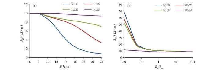 由于阵列侧向测井电极系往往比目的层厚度更大,所以电极系发射的电流会不可避免地流入围岩中,即视电阻率中会有上下围岩的贡献,进行围岩校正可以使得真电阻率的求取更加准确。研究了层厚、围岩电阻率对阵列侧向测井响应的影响,结果如图5所示。图5a计算参数设置:Rt为40 Ω·m,Rm为0.1 Ω·m,d为8 in,Rs为5 Ω·m,无侵入带存在;图5b计算参数设置:Rt为40 Ω·m,Rm为0.1 Ω·m,d为8 in,H为0.3 m,无侵入带存在。从图5a可知, 保持围岩电阻率不变, 当H小于0.4 m 时,MLR1~MLR4随层厚剧烈变化,即对于薄互层地层来说,对电阻率测井资料进行围岩校正是必不可少的;MLR1、MLR2、MLR3分别当H为2 m、4 m、6 m时基本不受围岩影响,不需要进行围岩校正,而MLR4对于大多数地层情况(0<H≤10 m)都需要进行围岩校正处理。4条曲线随着层厚变化会出现“下凹平台”现象,一般来说,探测深度浅的模式“下凹平台”现象明显,探测深度深的模式“下凹平台”范围大。从图5b可知,保持层厚不变,围岩电阻率偏离地层电阻率越大,视电阻率失真越严重,但当Rt/Rs<200后围岩电阻率继续减小对仪器响应影响不大。
