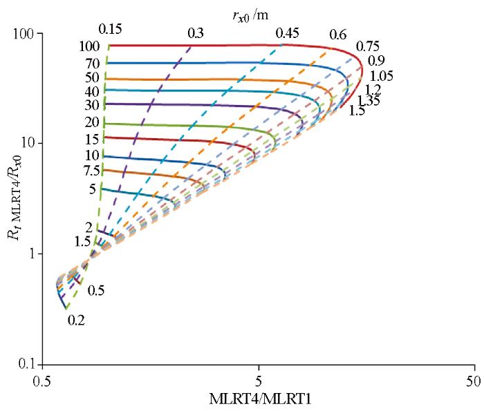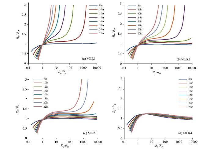 基于以上分析制作了泥浆侵入校正图版,如图8所示,利用该图版可实现泥浆侵入校正。在利用该图版进行校正时,需将微球型聚焦测井或邻近侧向测井视电阻率近似当做冲洗带电阻率,利用MLR1、MLR4进行插值,可以获取侵入带半径以及地层真电阻率。该方法操作简单,但资料利用率不高且图版覆盖地层条件有限。在泥浆侵入不深的情况下可以利用该图版进行校正,但针对侵入情况较复杂的地层,进行电阻率多参数反演是消除泥浆侵入影响的最有效的手段。