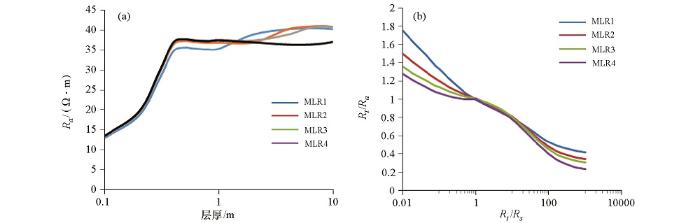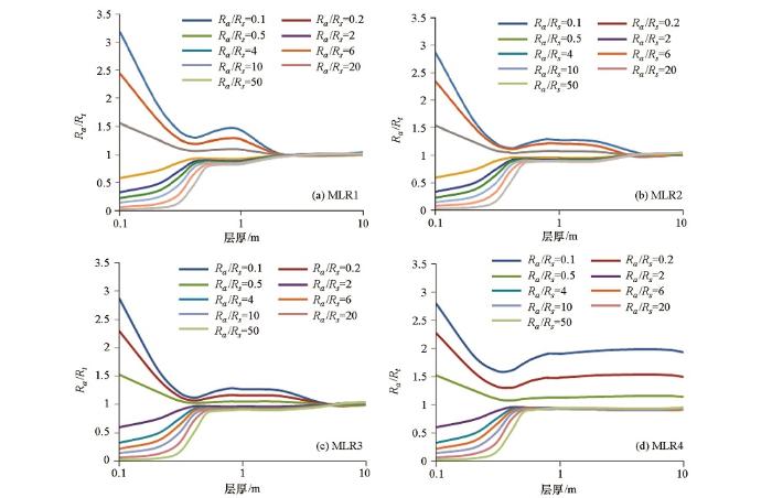 2) 当层厚小于0.4 m时,MLR1—MLR4随层厚剧烈变化;当 MLR1、MLR2、MLR3的层厚分别达到2 m、4 m、6 m时基本不受围岩影响;MLR4几乎对于所有地层(0<H≤10 m)都需要进行围岩校正。围岩电阻率与地层电阻率相差越大,电阻率失真越严重。