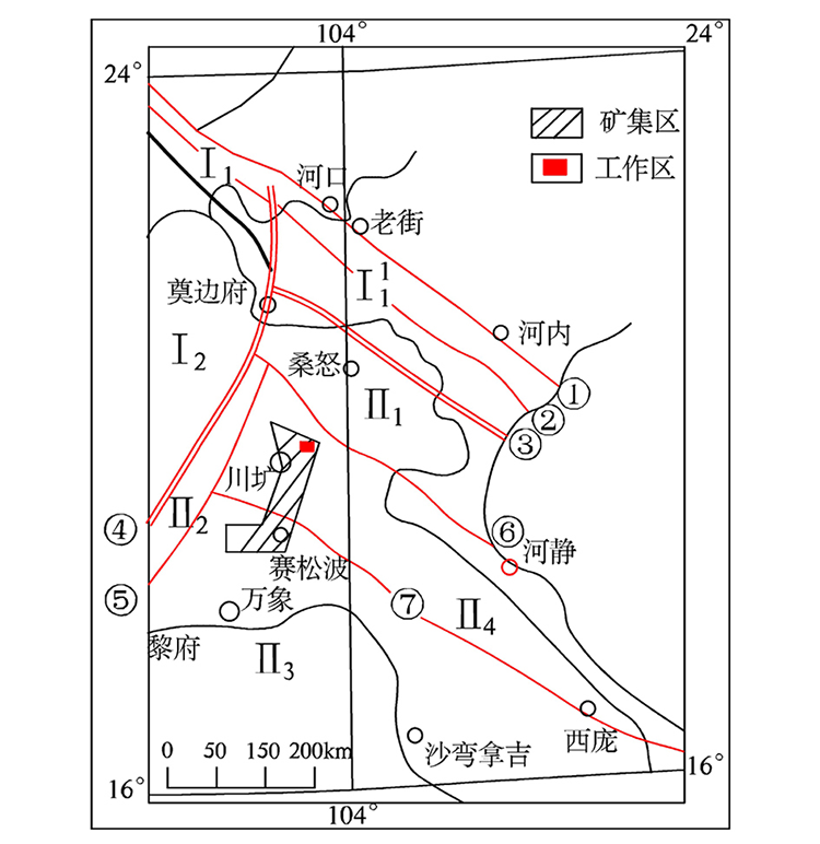 Fig.1 Location of Yue'e copper polymetallic mining area Ⅰ1—Changdu-Lanping-Simao block Mojiang-Lvchun Variscan-Indosinian fold belt;—Heishuihe Indosinian rift zone;Ⅰ2—Lanping-Simao-southern Mesozoic depression zone;Ⅱ1—east Indosinian block Majiang-Sangnu Variscan-Indochina arc zone; Ⅱ2—Luang Prabang Variscan fold zone; Ⅱ3—Vientiane(basin)-Kunsong (continental core) block; Ⅱ4—Xieng Khuoang-Changshan Variscan folded belt;① —Yuanjiang-Honghe fault;②—Ailaoshan-Heishuihe fault;③—Amojiang-Majiang suture zone;④—Dianbianfu-Chengyi suture zone;⑤—Puleishan-Mengmei fault;⑥—Lanjiang fault;⑦—Xieng Khuoang-Changshan fault