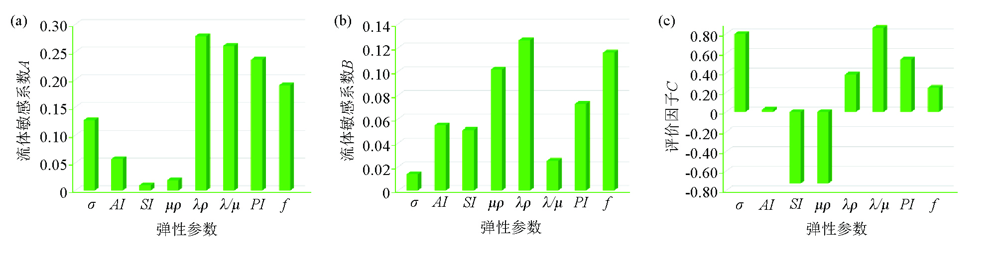 | 图7 不同弹性参数的流体敏感系数A(a)、孔隙度敏感系数B(b)和评价因子C(c) |