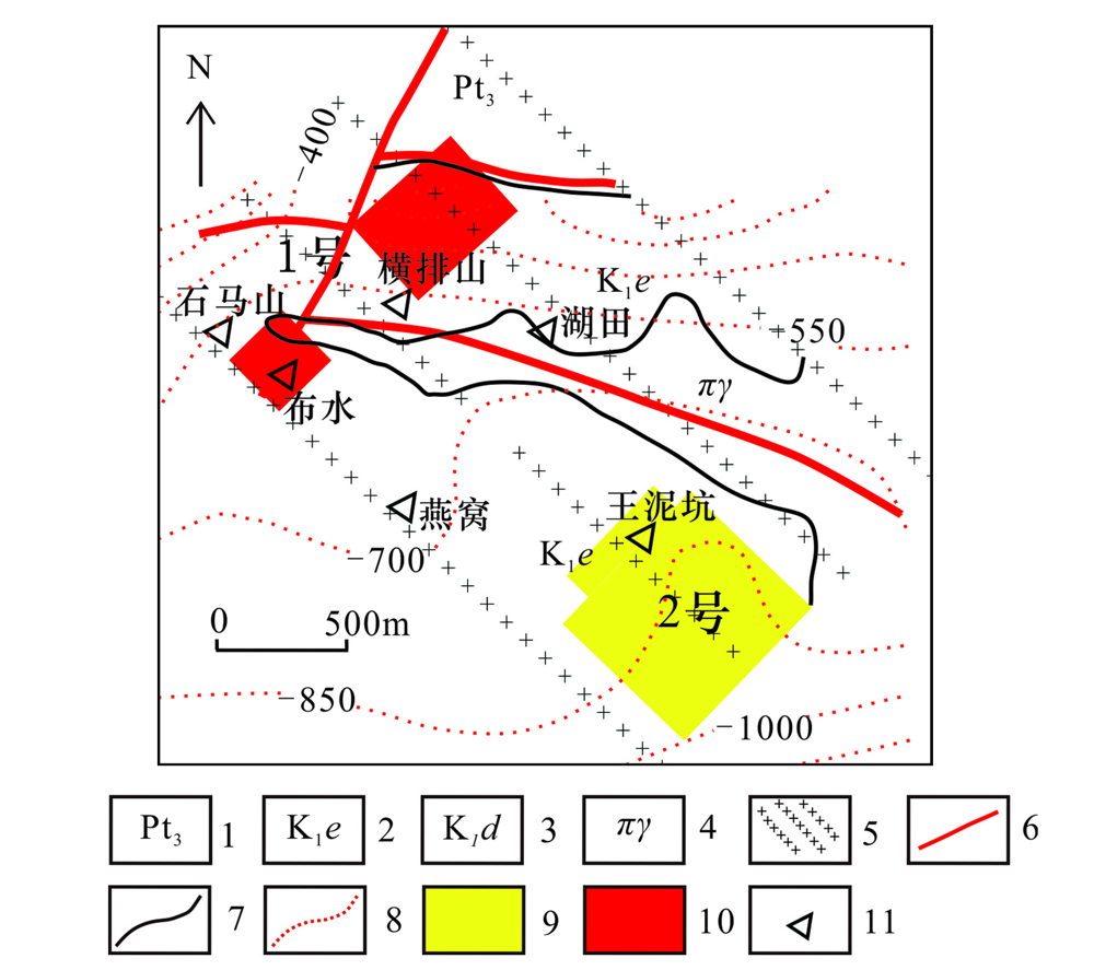 | Fig.10 A map showing predicted prospecting targets in the Xiangshan deposit 1—Neoproterozoic; 2—lower Cretaceous Ehuling formation; 3—lower Cretaceous Daguding formation; 4—subporphyritic granite; 5—geoelectric survey network; 6—fault structure; 7—geological boundary; 8—AMT inferred basal depth; 9—No.2 target area; 10—No.1 target area; 11—place name |