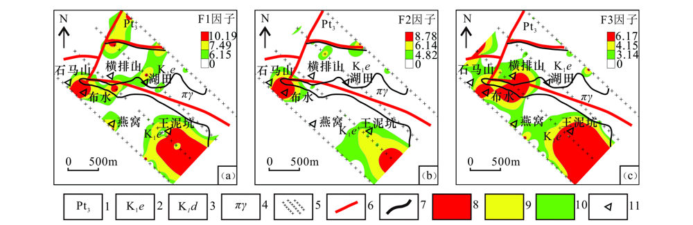 | 图8 游坊地区元素组合异常 1—新元古界;2—白垩系下统鹅湖岭组;3—白垩系下统打鼓顶组;4—次斑状花岗岩;5—地电测网;6—断裂构造;7—地质界线;8—异常内带;9—异常中带;10—异常外带;11—地名 |