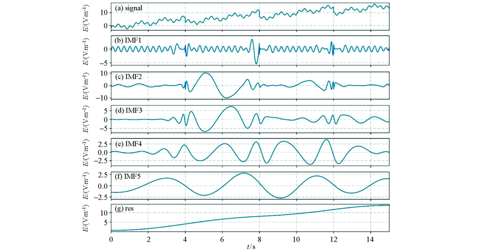 | 图3 对加入了锯齿波噪声的模拟电场信号进行EMD分解 a—加入噪声后的电场信号;b~f—IMF1~IMF5;g—剩余信号 |