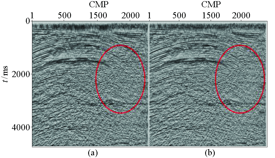 | 图11 不同采集方式的叠加剖面对比 a—常规流程常规检波器数据;b—本文流程单点检波器数据 |