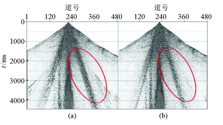 | 图6 去噪后单炮 a—先组合后去噪;b—先去噪后组合 |