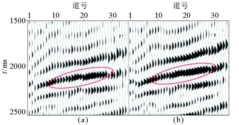 | 图9 动校正后道集 a—先做动校正再组合;b—先组合再做动校正后 |