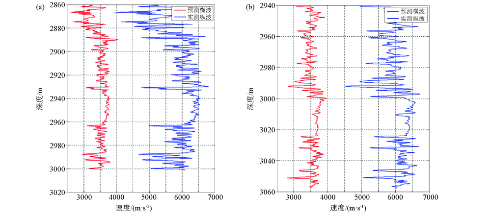 | 图4 工区两口生产井横波预测结果 a—生产井1;b—生产井2 |