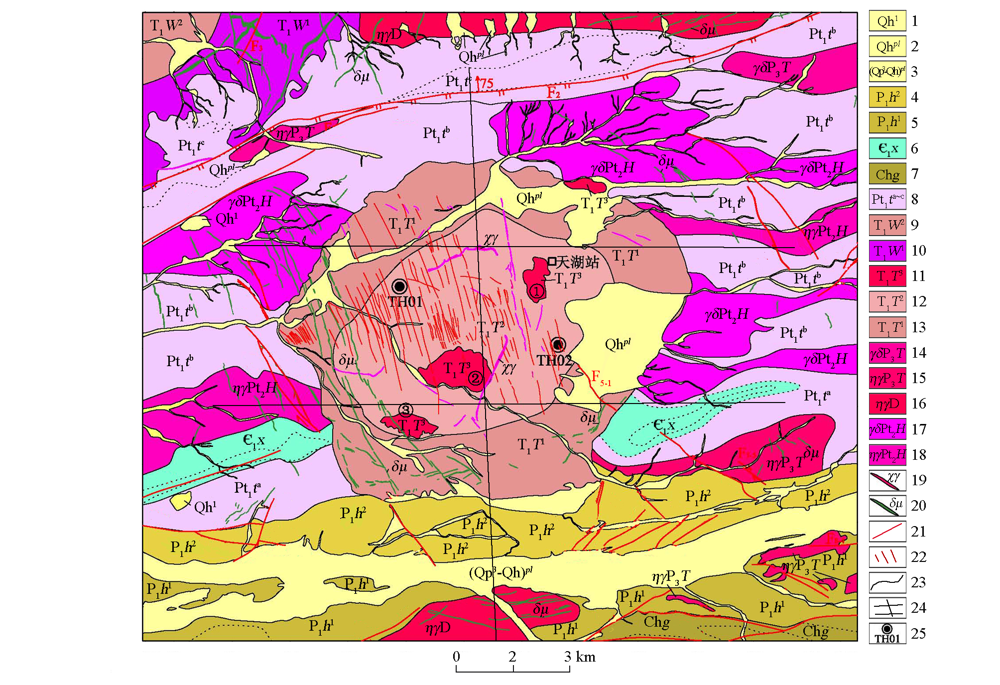 | Fig.1 Geological map of Tianhu area 1—Quaternary Holocene lake deposits; 2—Holocene alluvial deposits; 3—Pleistocene-Holocene alluvial deposits; 4—gray metamorphic conglomerate and sandstone of the middle section of Hongliuhe group; 5—gray metamorphic sandstone of the lower section of Hongliuhe group; 6—grey-black siliceous rock with breccia limestone of Cambrian Xidashan formation; 7—marble, dolomitic marble and schist of Changcheng system Gudongjing formation; 8—gray biotite schist, gneiss and marble of Tianhu iron ore rock formation ; 9—early Triassic Weiya monzonitic granite; 10—early Triassic Weiya sub-quartz syenite; 11—early Triassic Tianhu medium grain porphyritic biotite monzonitic granite unit; 12—early Triassic Tianhu fine-grained biotite granodiorite unit; 13—early Triassic Tianhu fine-grained monzonitic granite unit; 14—late Permian medium-grain biotite granodiorite; 15—late Permian medium-grain biotite monzonitic granite; 16—Devonian monzonitic granite; 17—Mesoproterozoic gneissic biotite granodiorite; 18 —Mesoproterozoic gneissic biotite potassium feldspar granite; 19—fine-grained granite veins; 20—medium-basic dykes; 21—faults; 22—fracture alteration zone; 23—geological boundary ; 24—profile position;25—drilling position and number |