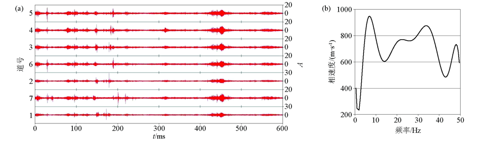 | 图6 7号剖面12号点的原始波形(a)及频散曲线(b) |