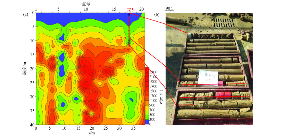 | 图8 微动勘探7号剖面异常图(a)及钻孔JZ5验证实物照片(b) |