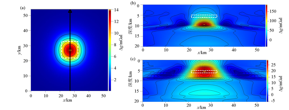 | Fig.2 Gravity DCSLO imaging of horizontal rectangular slab before and after configuration filtering a—gravity anomaly; b—DCSLO image before configuration filtering; c—DCSLO image after configuration filtering |