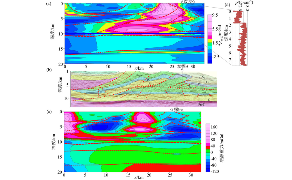 | Fig.6 Gravity and magnetic DCSLO imaging after configuration filtering and geological interpretation a—gravity imaging section; b—seismic interpretation section; c—magnetic imaging section; d—density logging data; e—profile orientation map |