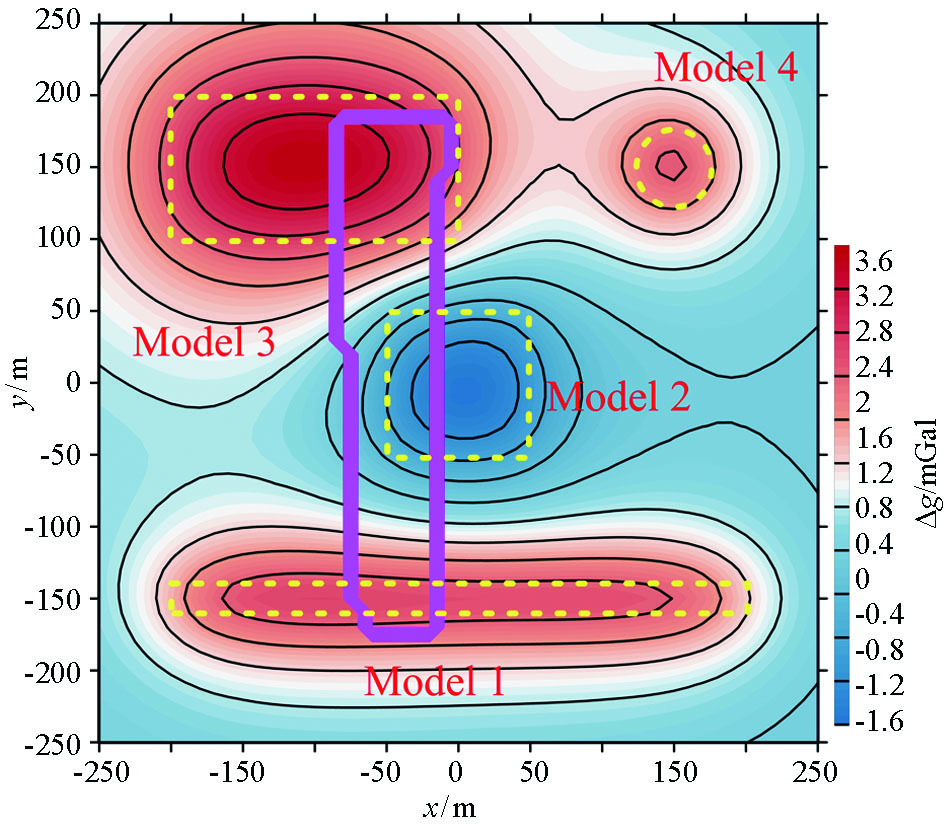 | 图3 组合模型产生的重力异常及缺失部位(粉色部分) |