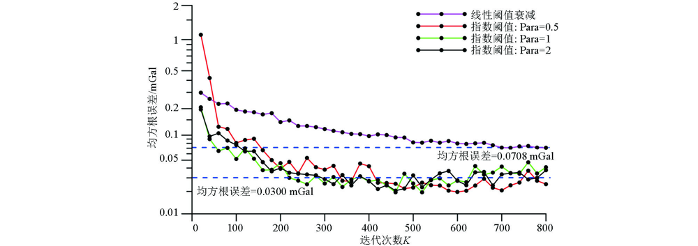 | 图5 线性及指数阈值衰减凸集投影算法的理论数据补空误差与总迭代次数K关系曲线 |