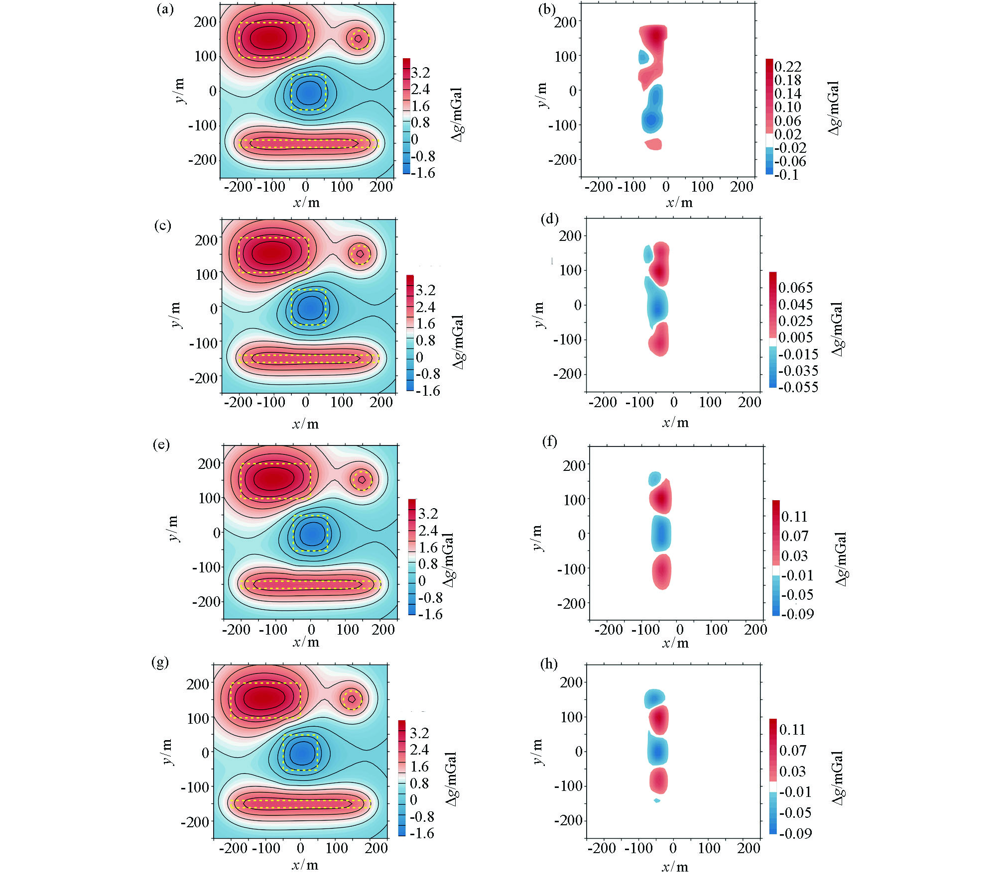 | 图6 基于线性、指数阈值衰减的凸集投影算法数据补空结果及与原数据的残差(K=800) a、b—线性阈值插值及残差; c、d—指数阈值(Para=0.5)及残差;e、f—指数阈值(Para=1)及残差;g、h—指数阈值(Para=2)及残差 |