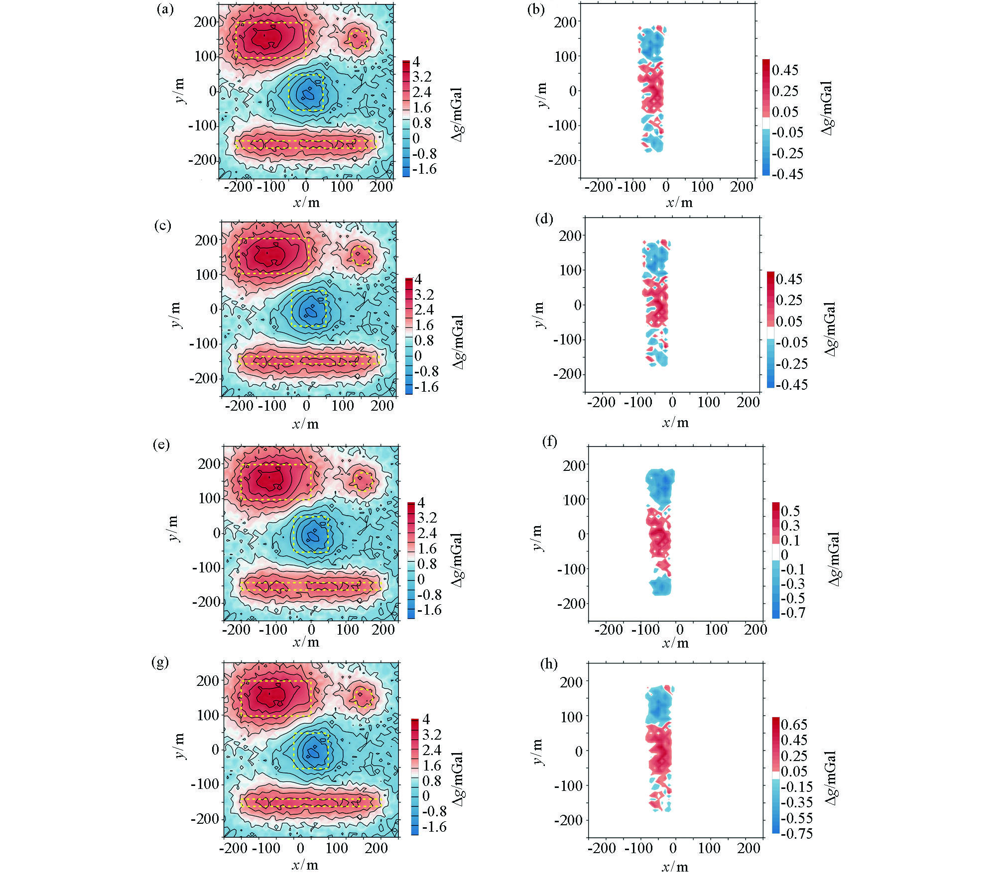 | Fig.8 Results of interpolating noise-corrupted data using conventional interpolation methods and the difference with the original noise-free data a、b—interpolated result of Kriging and its residuo;c、d—interpolated result of radial basis function and its residuo;e、f—interpolated result of inverse distance to a power and its residuo;g、h—interpolated result of minimum curvature and its residuo |