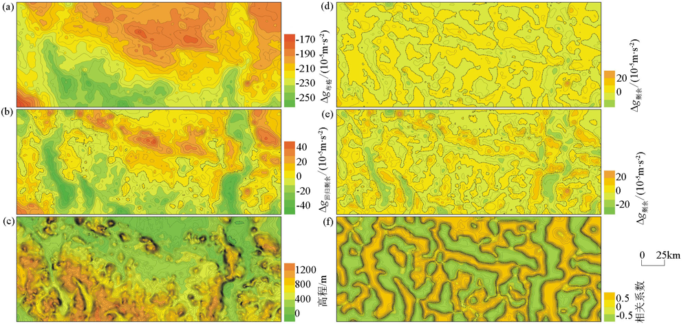 | 图2 A区重力测量成果处理分析对比 a—“布格”异常;b—“布格”回归剩余异常;c—地形等高线; d—(a)的剩余异常;e—(b)的剩余异常; f—(d)和(e)的相关系数 |