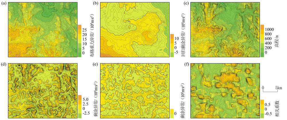 | 图3 B区重力测量成果处理分析对比 a—“布格”异常; b—“布格”回归剩余异常; c—地形等高线; d—(a)的“平均场”剩余异常; e—(b)的“平均场”剩余异常; f—(d)和(e)的相关系数 |