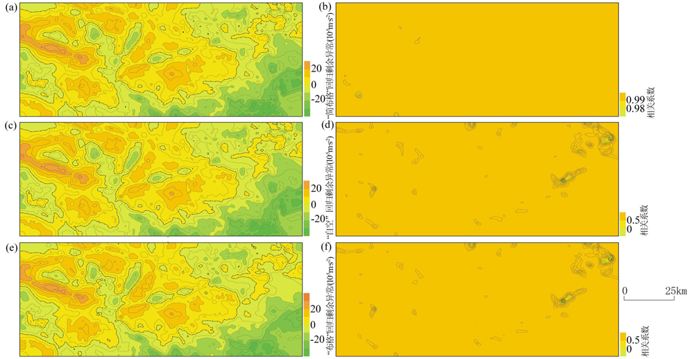 | 图4 C区“简布格”、“自空”和“布格”回归剩余异常三者关系对比 a—“简布格”回归剩余异常; b—“自空”回归剩余异常; c—“布格”回归剩余异常; d—(a)与(b)相关系数; e—(b)与(c)相关系数; f—(a)与(c)相关系数 |
