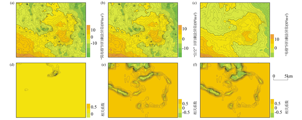 | 图5 B区“简布格”、“自空”和“布格”回归剩余异常三者关系对比 a—“简布格”回归剩余异常; b—“自空”回归剩余异常;c—“布格”回归剩余异常; d—(a)与(b)相关系数; e—(b)与(c)相关系数; f—(a)与(c)相关系数 |