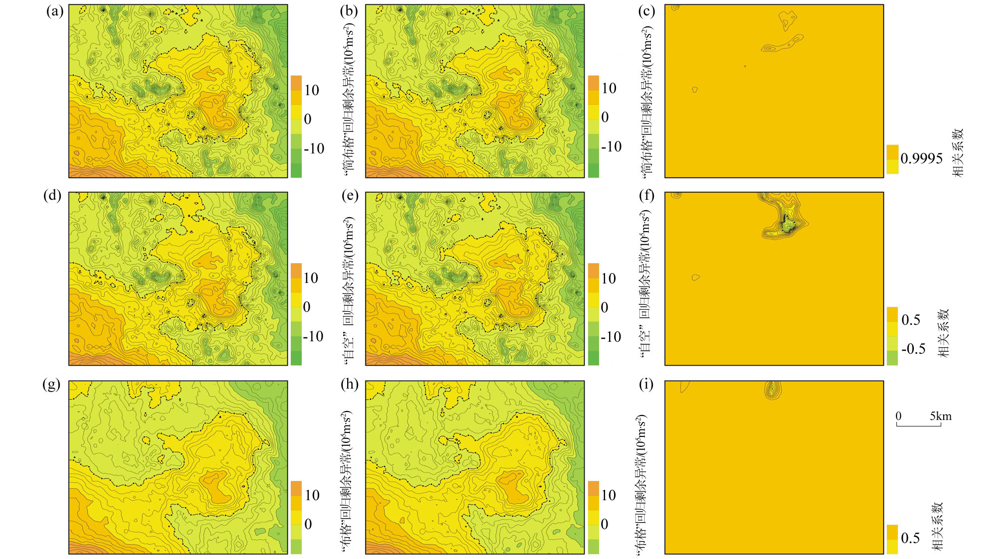 | 图6 B区不同起算点“简布格”、“自空”和“布格”回归剩余异常三者关系对比 a、b—“简布格”回归剩余异常; c—(a)和(b)相关系数; d、e— “自空”回归剩余异常; f—(d)和(e)相关系数;g、h—“布格”回归剩余异常; i—(g)和(h)相关系数 |