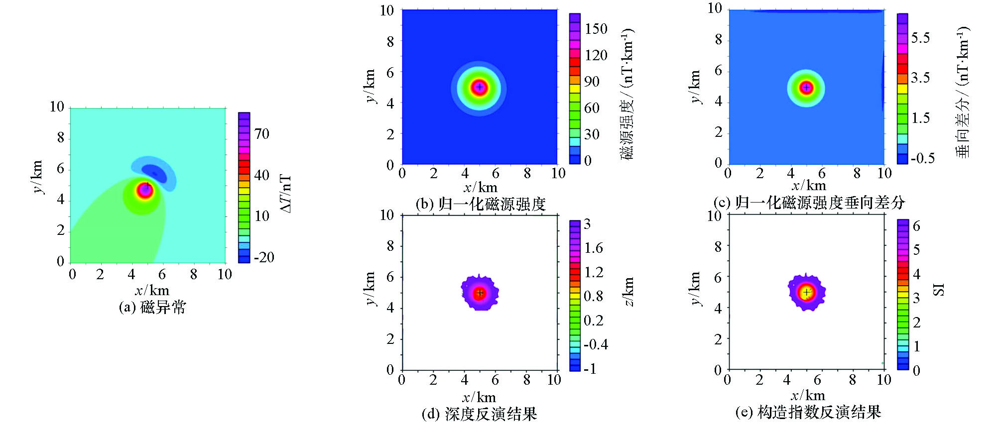 | Fig.1 Inversion results of magnetic anomaly produced by a single sphere model (z1=0 km, z2=0.2 km) |