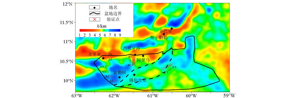 | 图12 盆地基底深度反演结果(Parker法)及验证点位置 |