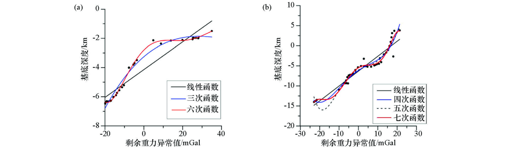 | Fig.13 Regression analysis results of residual gravity anomaly and seismic interpretation depth in areas A(a) and B(b) |