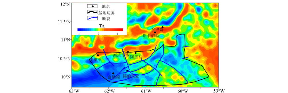 | Fig.7 Map of the fault distribution with TA of Bouguer gravity anomaly in Trinidad Basin |