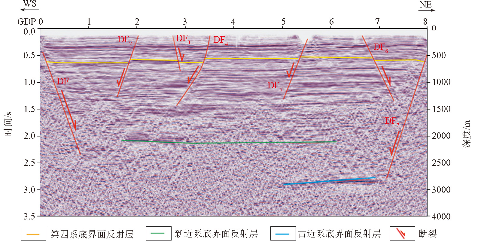| 图6 地热田北部可控源反射地震D1叠后偏移剖面及地震解释 |