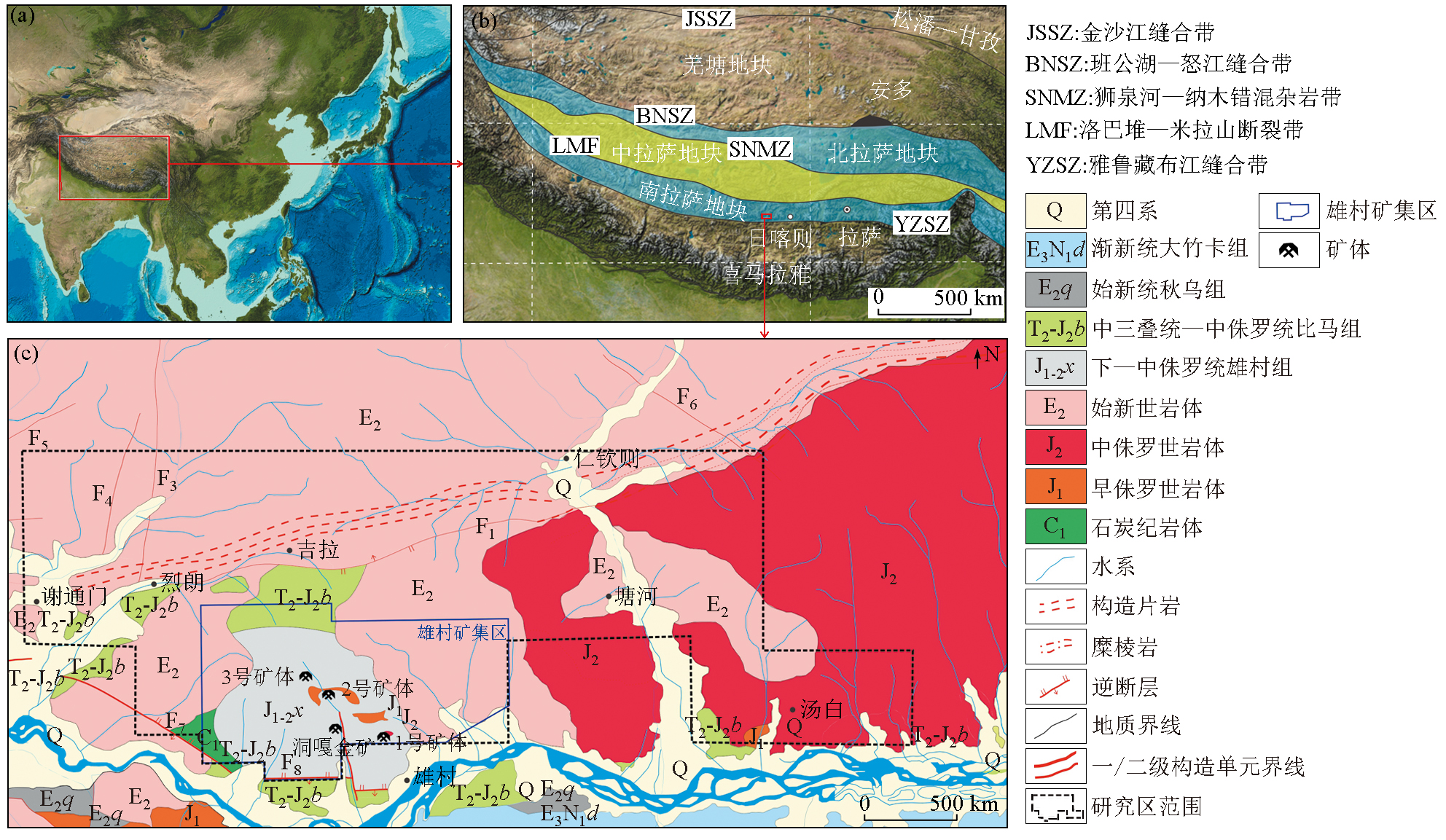 The location of the Xiongcun mining area and its surrounding geological structures (a, b) and geological map (c)[36]