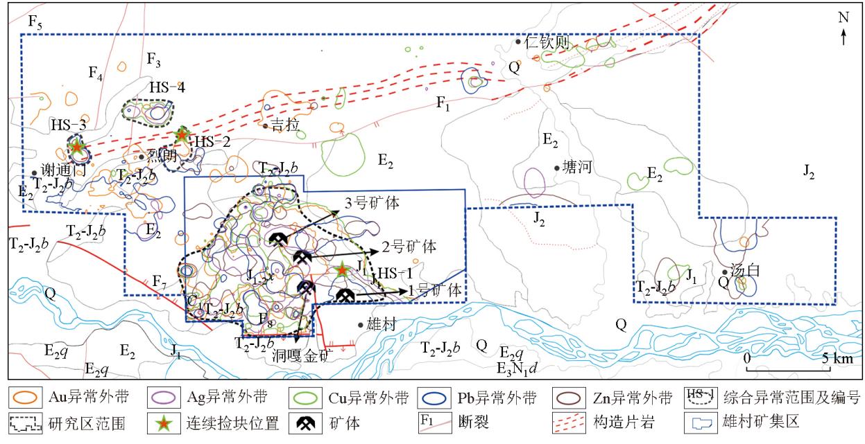 Abstract The Xiongcun ore concentration area in Xietongmen County, Tibet, is situated in the central segment of the Gangdise metallogenic belt. This study aims to investigate the distribution characteristics and geochemical anomalies of ore-forming elements in the study area and its periphery. This will guide the deployment of mineral exploration work in the study area and its periphery and promote the construction of the Xiongcun large-scale copper-gold resource base. Through the assessment of 1∶50000 stream-sediment geochemical anomalies in the study area and its periphery, this study determined the geochemical anomaly distributions and enrichment patterns of five elements (i.e., Cu, Au, Pb, Zn, and Ag) in the study area. Based on the analytical results of element anomalies and the geological characteristics of the study area, this study delineated the composite anomaly zones in the study area. Furthermore, this study assessed the prospecting potential of the study area through follow-up geochemical surveys. The results indicate that Cu and Au serve as the principal ore-forming elements in the study area. Both elements are characterized by strong enrichment and strong variability, showing high mineralization and prospecting potential. Four composite geochemical anomaly zones of stream sediments were identified. Among them, zones HS-1 and HS-2 exhibit highly consistent composite anomalies. Both zones show the distribution of known ore deposits (occurrences) or significant mineralization shows, suggesting considerable potential for ore prospecting. Overall, this study provides geochemical evidence for geological prospecting in the Xiongcun ore concentration area and its periphery while also offering ideas and a reference for subsequent mineral exploration targets in the study area.