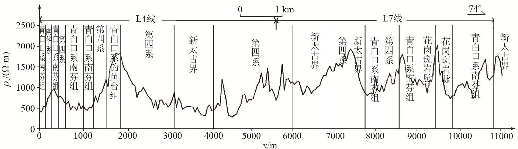 | 岩性 | 样本数 | 幅频率F平均 值/% | 电阻率ρ平均值/ (Ω·m) | | 片麻岩 | 55 | 1.4 | 1700.5 | | 闪长岩 | 35 | 1.1 | 2480.6 | | 变质砂岩 | 35 | 1.6 | 3054.6 | | 泥质板岩 | 30 | 5.4 | 1021.7 | | 大理岩 | 40 | 1.6 | 2350.1 | | 矿化岩脉体 | 25 | 8.5 | 65.6 |