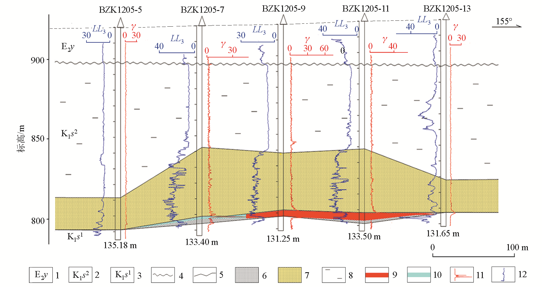 Geological profile map of B1205 line ore body in the southern part of Manglai uranium deposit 1—Irding Manha Formation; 2—upper section of Saihan Formation; 3—lower section of Saihan group; 4—inconsistent stratigraphic angle; 5—lithological boundary; 6—gray sand body; 7—oxidation sand body; 8—mudstone layer; 9—uranium ore body; 10—mineralized body; 11—quantitative gamma logging curve,γ/(nC·kg-1·h-1); 12—three lateral apparent resistivity logging curve,LL3/(Ω·m)