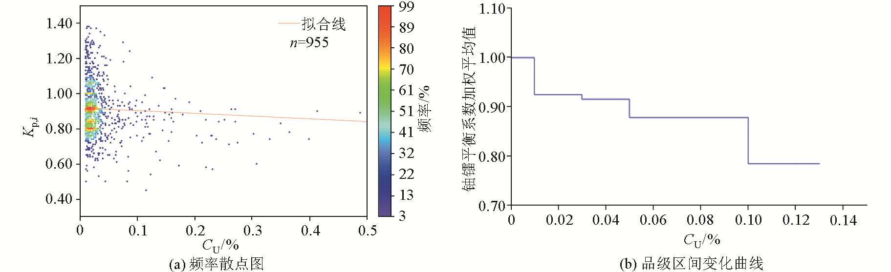 | 品级区间/% | 样品数 | Kp | 平衡情况 | 备注 | | <0.010 | 314 | 1.00 | 平衡 | | 统计 时剔 除异 常值 | | 0.010~0.050 | 669 | 0.92 | 略偏铀 | | | 0.030~0.050 | 138 | 0.91 | 略偏铀 | | | 0.050~0.100 | 78 | 0.87 | 较偏铀 | | | ≥0.100 | 70 | 0.77 | 严重偏铀 | |
