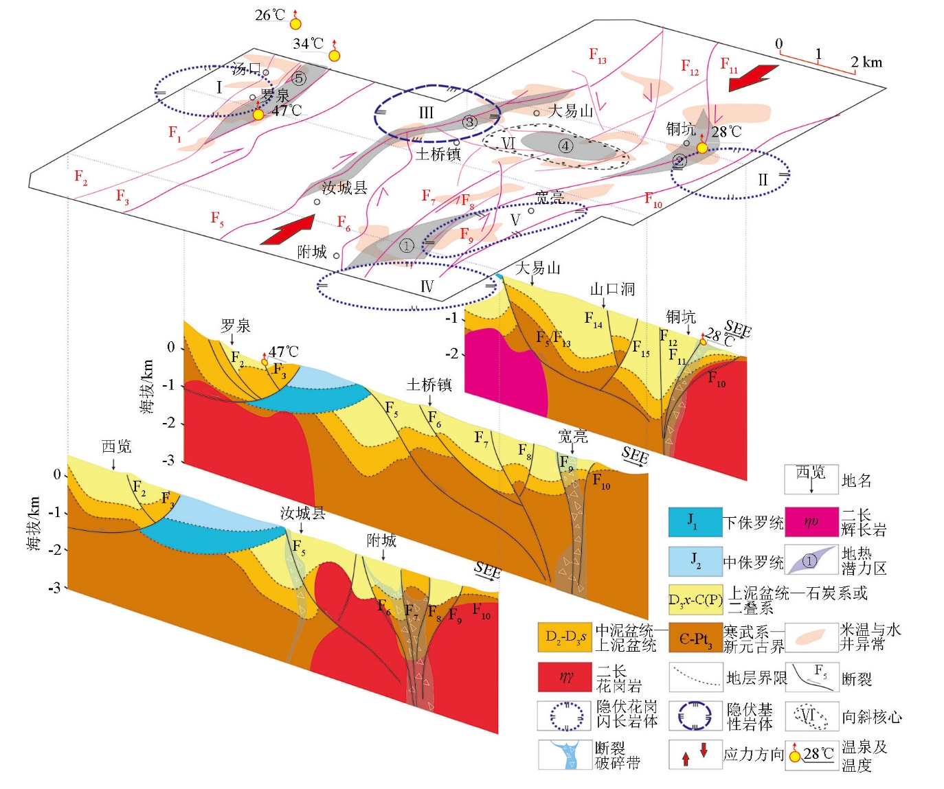 Abstract Geothermal resources are significant clean energy and tourism mineral resources. The Rucheng Basin, a carbonate basin in the southeastern mountainous area of Hunan Province, possesses favorable conditions for the formation of convective geothermal energy. However, the basin is enclosed on three sides by the giant Zhuguangshan rock mass, and its basement is subjected to the intrusion and destruction by the rock mass, resulting in severely deformed formations, crisscrossing faults, and significantly different eastern and western structures. The understanding of the basin's water- and heat-conducting pathways and deep reservoir structures remains elusive, thus restricting the investigation of the basin's geothermal potential. Hence, this study probed the basin's deep structures through gravity survey and audio magnetotellurics (AMT), obtaining the following insights: (1) The Rucheng Basin has developed into a bidirectional ramp structure due to east-west differentiation. The synclinorium in the east experienced compression and clockwise rotation due to the emplacement of the Yanshanian rock mass, rocks were fragmented in the core zone, and strike-slip fracture zones were found at the boundary. The faults have vertical cutting depths exceeding 4 km, widths ranging from 300~600 m, and dip angles between 80°~90°. (2) The basin's basement anticlinal axis hosts several NWW-directed concealed rock masses, with diameters from 3~4 km and buried depths from 0.5~1.5 km. Hot springs reside in the fracture zones crossing the boundaries of the concealed rock masses. (3) The basin boasts favorable conditions for the formation of convective geothermal energy. Folds, fault zones, and concealed rock masses match each other to form a unified spatial combination of heat-controlling elements, manifesting heat accumulation characterized by east-west recharge and intermediate discharge. With more thriving deep geothermal reservoirs in the east, the basin has high potential for geothermal resources.
