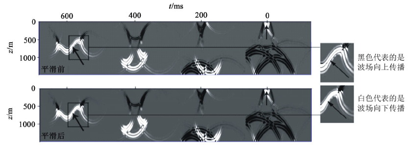 图7所示为双层速度模型第100炮的炮点波场Poynting矢量水平分量平滑前后对比, 图8所示为双层速度模型第100炮的检波点波场Poynting矢量垂直分量平滑前后对比。通过图7、图8的对比可以发现, 在箭头所标注处, 平滑后的Poynting矢量传播快照相比平滑前的, 其传播信息更加完整连贯, 传播图像也更加清晰可辨:经过对传播快照的部分放大, 可以发现, 平滑前的Poynting矢量传播快照中存在着许多间断点, 多处存在着不连续的现象, 而在平滑后的Poynting矢量传播快照中, 可以看到大多数的间断点都得到了补偿。但是, 同样地也可以看到某些传播快照中存在着由于随机边界的设定所产生的噪声, 这影响了Poynting矢量传播快照的成图质量, 从而会影响最终的逆时偏移剖面成像质量。同时, 在平滑后的传播快照中, 仍可见大量区域内的Poynting矢量值是非连续的, 说明文中所采用的平滑方式仍存在着缺陷, 但不可否认的是, 通过文中所提及的平滑, 能更加高效精确地求取位移对时间求导为零点处的Poynting矢量的水平、垂直分量。
