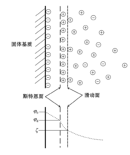 在野外三种动电学现象会导致自然电位异常, 分别为:流动电位现象[2, 8, 9]、热电和电扩散现象[2, 10, 11]、电氧化还原作用[12, 13, 14], 所有这些动电学现象均因为孔隙流中带电固体颗粒表面的电扩散层中的电荷相对移动[15]。图1给出了多孔介质表面的电荷分布(双电层模型), 固体介质表面一般带有负电荷, 其周围存在电场, 吸引溶液中的阳离子, 由于静电引力差异, 介质表面的阳离子呈现不均匀分布, 越靠近表面, 引力越强, 阳离子浓度越大。随着与介质表面距离的增加, 引力逐渐降低, 阳离子浓度也逐渐下降, 同时阴离子浓度逐渐增加, 直至达到正常浓度为止。滑动面之外的扩散层中阳离子多于阴离子, 该层的离子因水流而移动, 从而产生电流和电场。这就意味着土壤中地下水的流动将产生自然电位异常, 而地下水流动与介质结构又是密切相关的。因此, 从理论上讲, 通过监测自然电位, 介质结构可以被间接地反映出来。