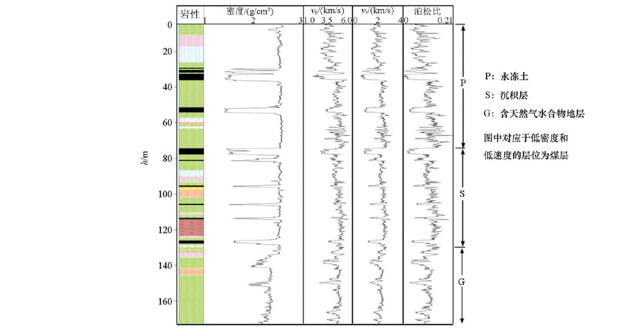 在祁连山木里地区, 经钻井发现的天然气水合物位于永久冻土层之下, 钻孔揭示的天然气水合物呈薄层状、团块状赋存于泥质粉砂岩、细砂岩、泥岩的裂隙面上。图3为在祁连山木里冻土区天然气水合物DK-1科学钻探试验孔得到的速度、密度测井曲线[2]。由该测井结果可以看出, 密度、纵横波速度与泊松比的测井曲线特征类似, 即含天然气水合物地层具有较低的密度和纵、横波速度及泊松比。而冻土区则具有较高的密度和纵、横波速度及泊松比。