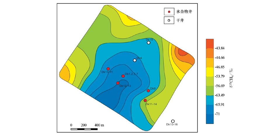 甲烷碳同位素在试采区有明显的空间分布特征(图4), 甲烷碳同位素值与天然气水合物有良好的对应关系, 低值区位于天然气水合物试采井上方, 甲烷碳同位素值大于-50‰ , 表现出明显的微生物成因, 在水合物试采井周边地区则表现出热解成因, 包括煤矿区。这是一个很有意义的发现。在之前的地球化学调查研究中, 煤矿区和天然气水合物试采区都表现出地球化学异常[61, 62], 甲烷碳同位素对水合物的指示作用还需要更深入的研究。