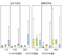 对3年数据分区进行统计分析, 分别计算其最大值、最小值、上下四分位数和中位数, 可以更直观的显示数据分布情况(图4)。结果显示, 顶空气甲烷数据在3个子区都以明显上升趋势出现, 又以2013年数据上升趋势最为明显, 也证实了这种异常可能是短时间内大量钻井的进行, 导致地下烃类气体的向上渗漏造成的。
