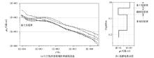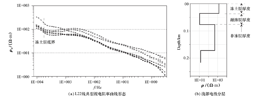 图7是高阻区典型视电阻率曲线形态一及电性分层, 图7a为L43线典型视电阻率曲线形态, 在高频段存在一个高阻层, 推断为冻土层, 图7b的浅部电性分层为高阻— 低阻— 高阻特征, 第一高阻层解释为冻土层, 电阻率为5 000~6 000 Ω · m, 厚度在45~60 m之间, 低阻层为冰土混合状的融溶层, 电阻率为160~300 Ω · m, 厚度在30~45 m之间, 第二高阻层为非冻岩层, 电阻率为900~1 100 Ω · m, 比冻土层的电阻率小6~8倍。