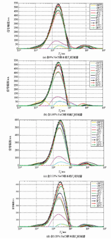1) 正温区间:在此温度区间土样的NMR信号的产生以束缚水为主, 离子浓度越大, 土样中束缚水越多, 其NMR信号越强, 但是由于土样的孔隙度等不变, 因此离子浓度对弛豫时间的影响不大。