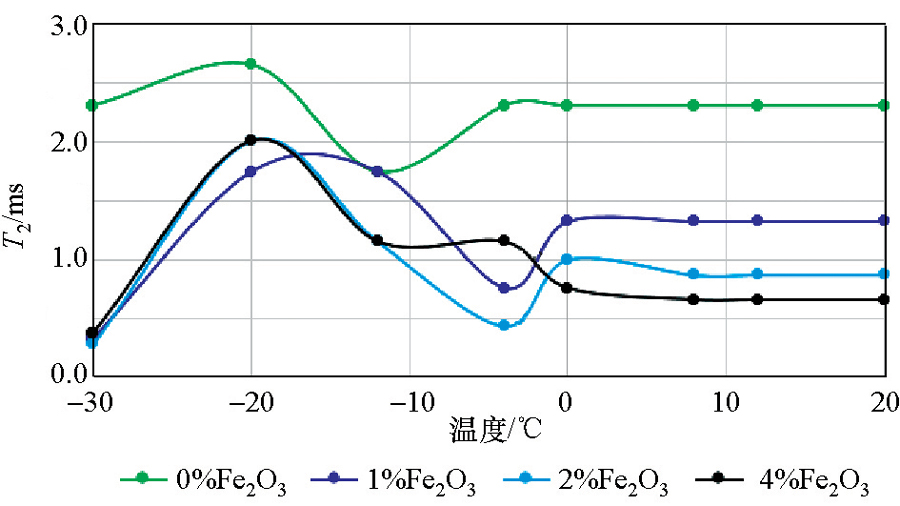 3)某些顺磁性物质本身能与水发生化学作用或者具有吸水性, 形成的双电层能够阻碍水的冻结, 这种物化作用与顺磁性矿物引起的磁性不均匀(会随温度发生变化)会对NMR信号带来双重影响, 使得负温区间顺磁性矿物对NMR信号的影响比较复杂:Fe2O3含量较低时(1%, 2%), 顺磁性物质引起的弛豫加快占主导因素, 使得T2值下降速度较不含Fe2O3时变快; Fe2O3含量到达4%时, Fe2O3粒子与水的物化作用使得弛豫减缓占主导因素, 使得T2值反而变大;