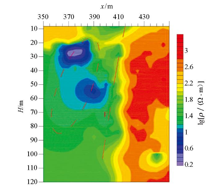 1线的地表地形起伏不大。纵向上整体存在分层现象,表层介质电阻率值很小,普遍在100 Ω·m以内,是第四系覆盖层的反映;随着深度的增大,介质电阻率值明显增大,普遍大于500 Ω·m,是基岩白云质灰岩的反映。横向上覆盖层厚度变化较大,有些地方很厚,有些地方则很薄,变化范围为1~10 m,而在基岩中存在明显的横向电阻率值突变和低阻异常带,主要在274~323 m、358~421 m和449~484 m,推测在358~421 m测线段可能存在一条局部断层,倾向往测线小号方向。
