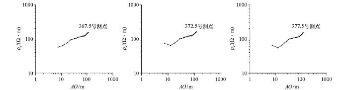 Three single apparent resistivity sounding curve of line 2 beside 375 m