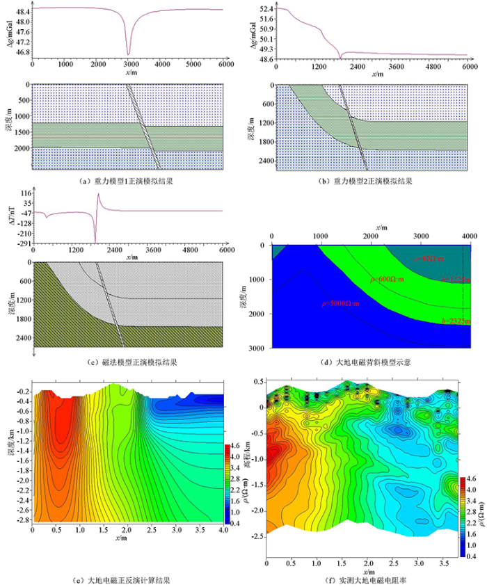3) 针对隐伏断层的实测重力、磁法、大地电磁资料的解释得出:三叠系嘉陵江组的断层破碎带的地球物理异常特征为低重力异常、低电阻率异常。重力异常和大地电磁异常有良好的对应效果,说明重力和大地电磁方法是探测川东高陡断褶带隐伏断层的有效方法之一;而磁法异常不明显,主要因为川东地层岩石磁性差异较小,导致实测成果未能达到正演的效果。