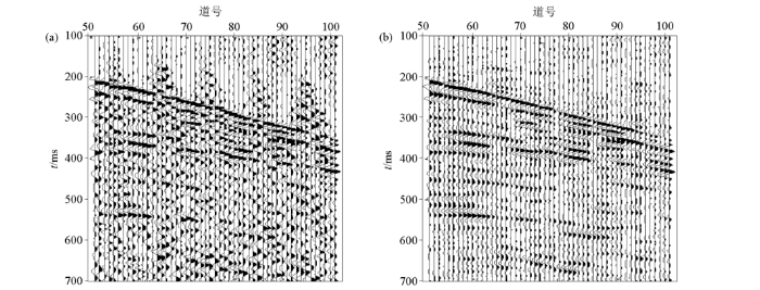 接下来按照第二节介绍的步骤,利用设计的阈值函数对含有线杆共振干扰的数据做进一步处理,最终去除的线杆共振干扰噪声如图8 所示,去除的噪声表现出有规律分布的扫帚状低频记录。最终去除的结果如图9 b所示,与图7 b对比观察可以发现,经阈值函数处理后的剖面中有效信息更丰富,尤其是浅部200~350 ms的反射形态更为清晰。将原始数据与去噪结果进行对比(图9 ),可以看到,原始数据中的线杆共振干扰得到了有效压制,反射信号同相轴的连续性、清晰度均有所提高。频谱分析对比如图10 所示,由于最后一步使用固定阈值压制随机噪声时添加了白噪声,因此去噪后的频谱在低频与高频段均出现了少量能量,能量占比较低,对有效频带宽度没有明显影响。经过频谱对比分析可得出,两者的有效频带宽度相近,但去噪数据在40~70 Hz优势频段的能量占比提高的较为明显,与实际记录对比结论一致,去噪数据的信噪比与分辨率均有提高。整体上,本文所提出的基于Curvelet变换的线杆共振干扰去除方法可以获得较好的去噪效果,能在最大程度保护有效信号的基础上分离线杆共振干扰波。